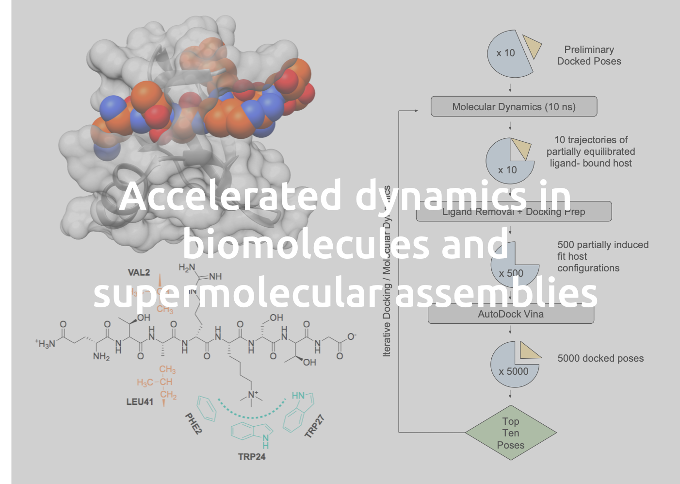 Nanocomposites are mixed materials in which at least one of the components has dimensions on the length scale of nanometers. They offer the possibility of combining the desirable properties of each of the constituents. Nanocomposite materials have been fabricated for a variety of applications in opto-electronics, electronics, intracellular manipulation, electrolytes in batteries, coatings, gas separation, etc. We are developing new, multi-scale methodologies for the calculation, leading to optimization and control, of the bulk dielectric and optical properties of these materials.Self-assembly is at the root of a broad array of biochemical processes, and also of the bottom-up approach to nanotechnology. In nanotechnology, the idea is to design particles which interact and come together in specific predetermined ways, to produce the desired self-assembled complex or device. Our studies span fundamental principles of self-assembly, design of functional materials from organic-inorganic assemblies, and industrial applications in atomic layer deposition processes.In an attempt to elucidate the complex interactions leading to biomolecular assemblies, we are developing methodologies capable of describing the structural outcomes of the self-assembly process. Accelerated sampling techniques are particularly important when the host biomolecule is flexible, undergoing adaptations to the binding process, whereas bulky ligands, such as new peptidomimetic therapeutic agents, also add complexity to the potential energy surface sampled by the complex.